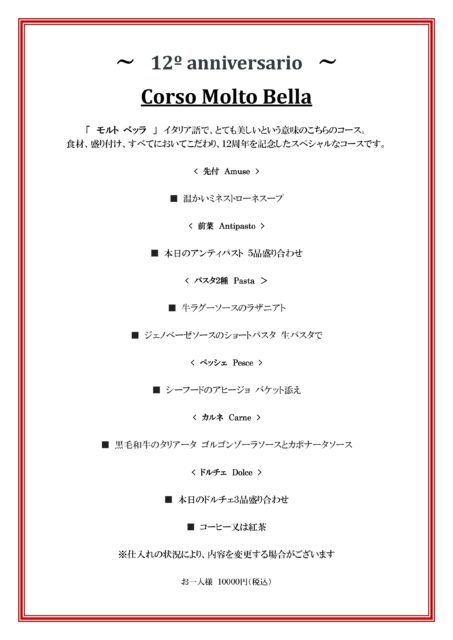 ☆ 当店のスペシャリティ「12周年記念 Molto Bella モルトベッラ コース」¥10000 11~12月の期間限定コースです。