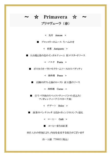☆春のコース!!「Primavera プリマヴェーラ 」¥7700 3月~4月の期間限定コースです。