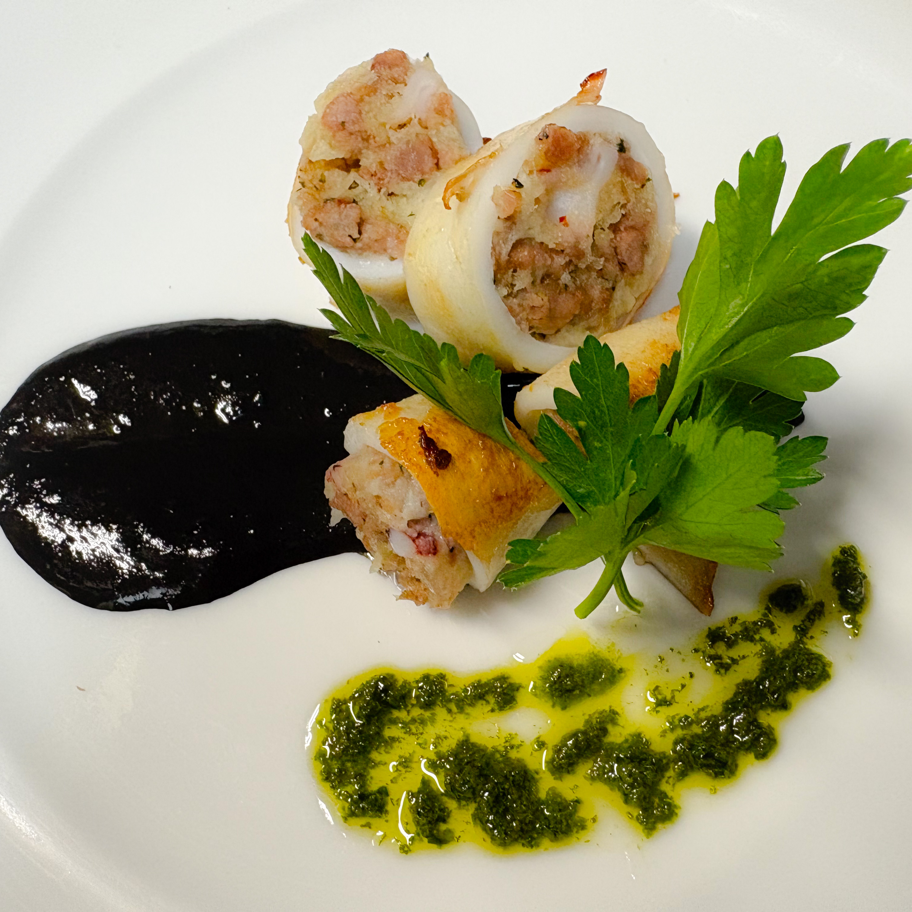■ ヤリイカのサルシッチャ詰め(リピエーヌ) イカ墨ソース