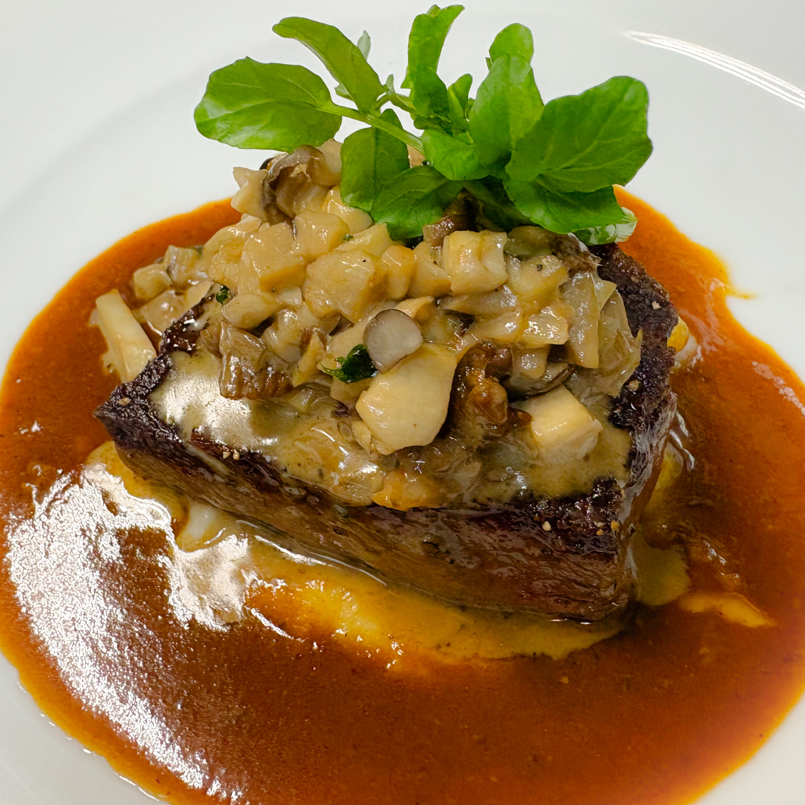 ■ 黒毛和牛のビステッカ ポルチーニ茸とキノコのデュクセルのせ マルサラソース